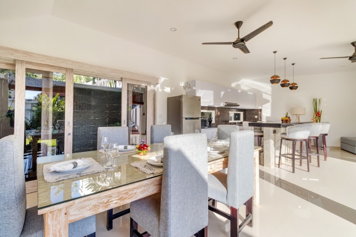 Poolside living area that is open-plan with additional space for a dining table and a fully-equipped modern kitchen. Six-seater dining table.