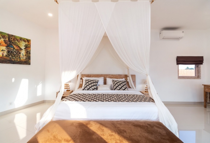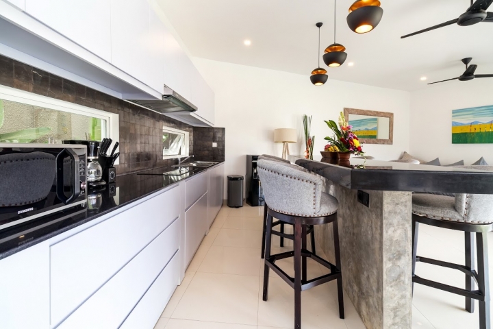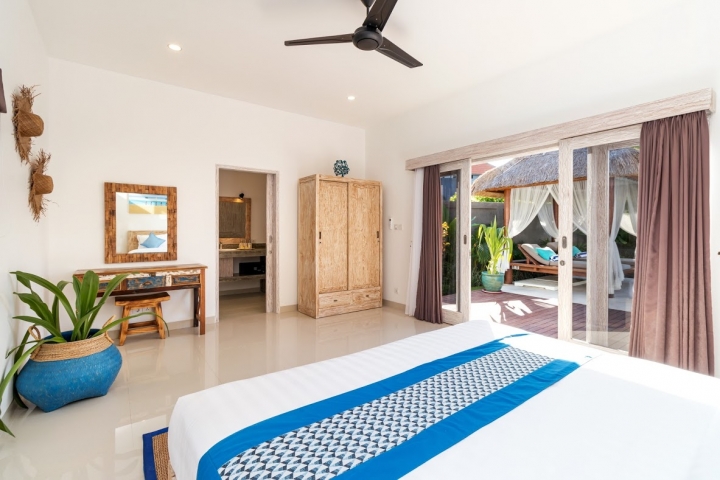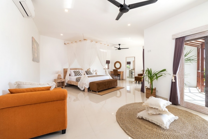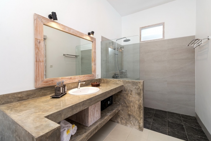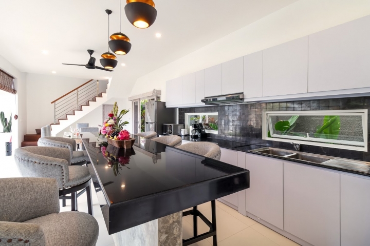 Four air-conditioned bedrooms: master suite is found upstairs and the remaining three are found poolside with glass doors that lead you directly to the pool, one of them with single beds. Each bedroom comes with an ensuite bathroom.