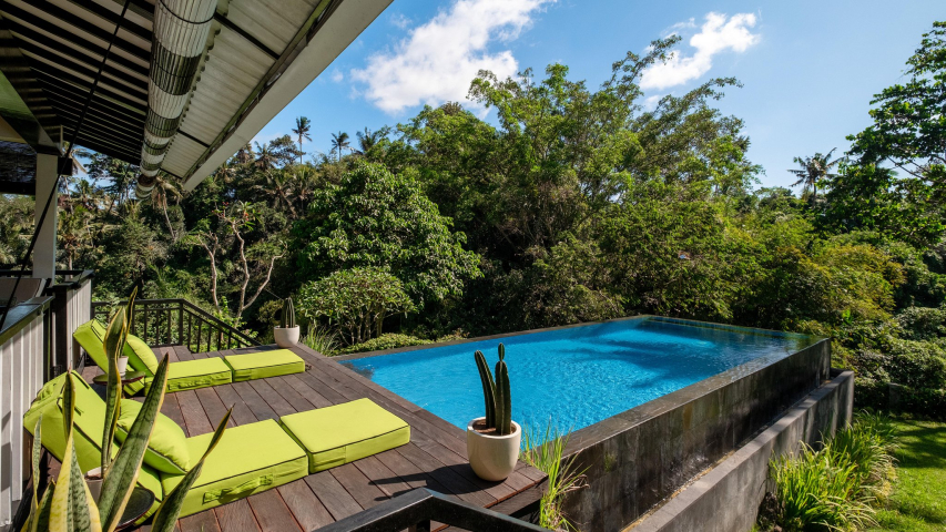 This amazing 3 bedroom villa in Ubud offers unique views to jungle and river. Nature is part of experience in this villa, with gentle visits from chickens, geckos, beautiful birds and other local wildlife.