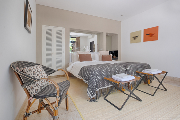 The villa sleeps seven (including 3 children), with a master bedroom and adjoining bunk bed room for three children, as well as a separate twin bedroom, both with ensuite bathrooms.