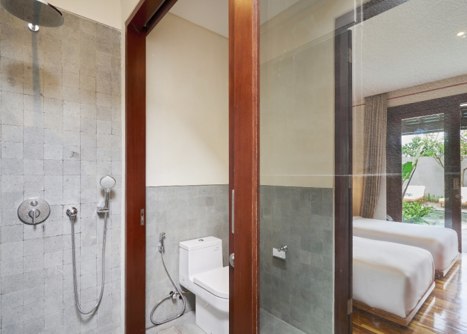 Step outside to your private oasis featuring a refreshing swimming pool surrounded by lush tropical gardens, perfect for soaking up the sun on our comfortable sun chairs.