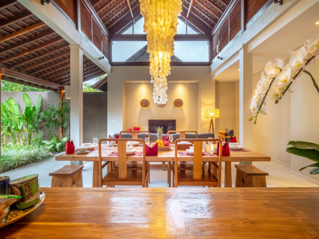 Each villa adorned with an open living area, fully-equipped kitchen, inviting dining table, cozy sofa, and entertainment with a TV.