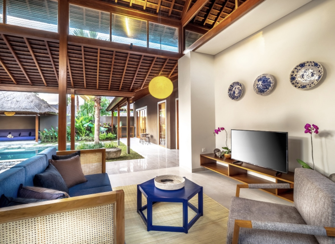 Each villa adorned with an open living area, fully-equipped kitchen, inviting dining table, cozy sofa, and entertainment with a TV.