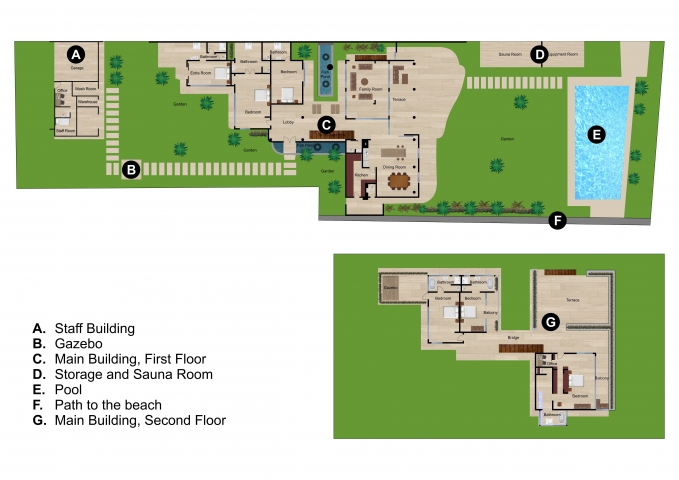 Five bedrooms over two levels compose the main building of villa. All bedrooms feature a private en-suite bathroom and a private open area. Each bedrooms has it’s unique atmosphere.